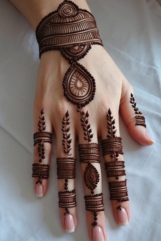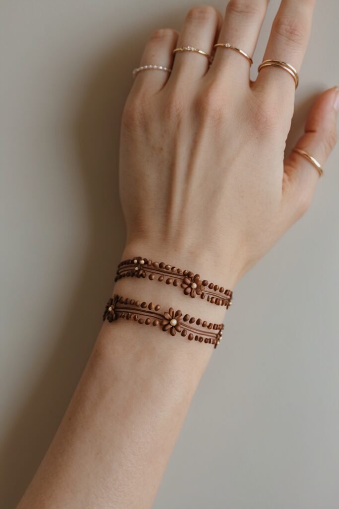 A thin band around your wrist with small geometric shapes or tiny florals. Think of mehndi as subtle wrist jewellery.