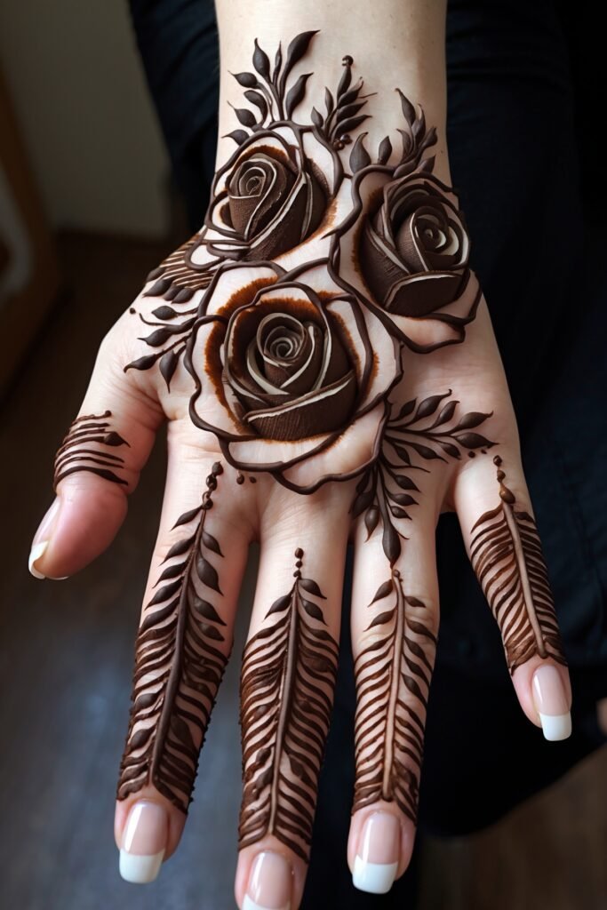 This fusion henna suits women who love tradition but also want modern vibe. It works with salwar kameez or contemporary outfits.