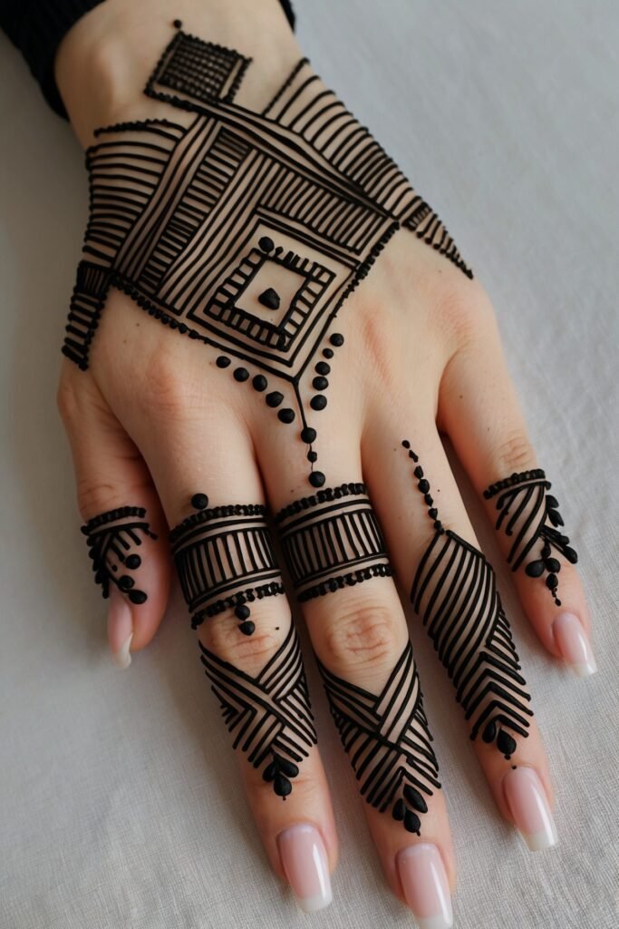 Use triangles squares lines symmetric shapes and clean spaces. Geometric mehndi gives fresh modern edge.