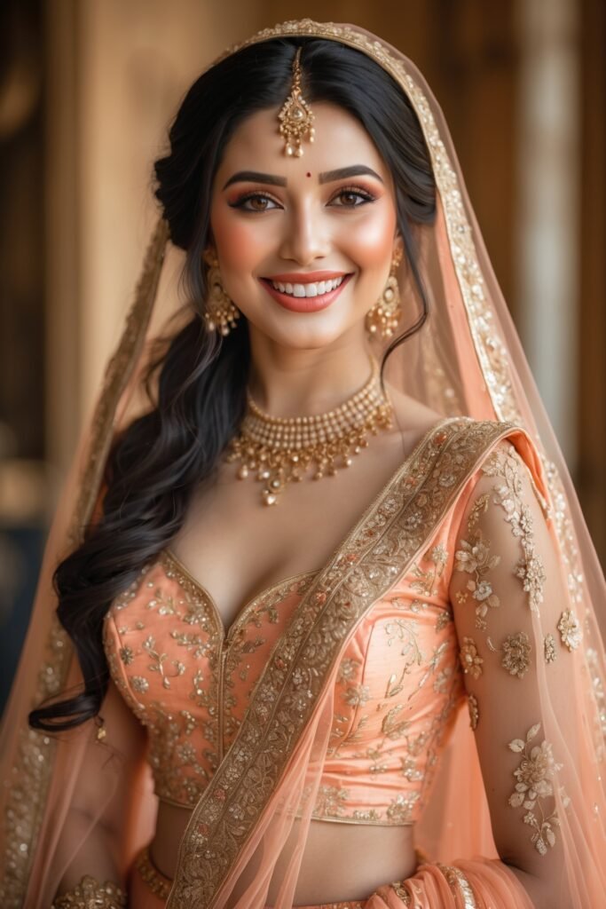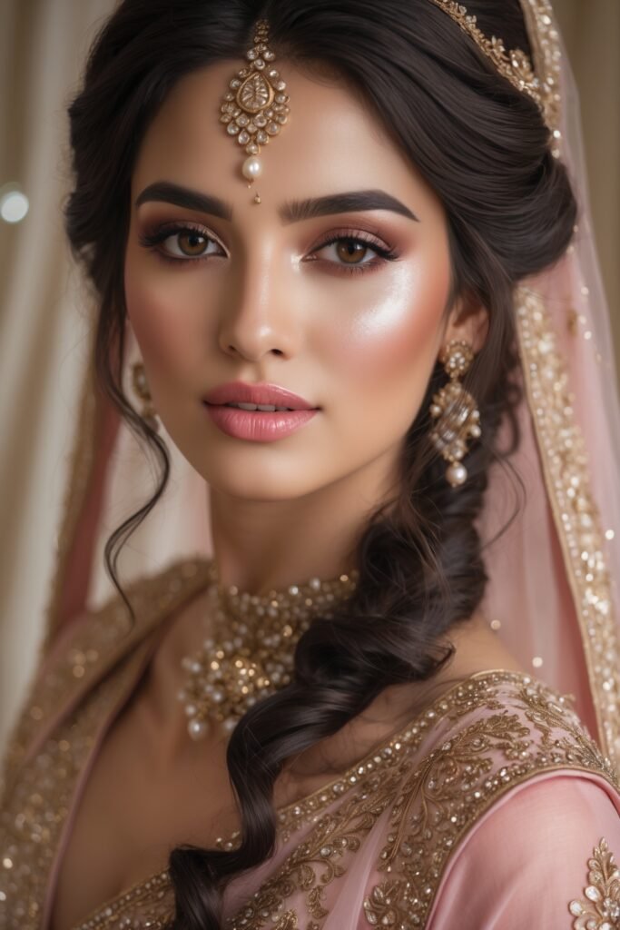 For brides who want something romantic, a soft pink or peach makeup look is dreamy and delicate. Think fresh, glowing skin and rose-kissed lips.