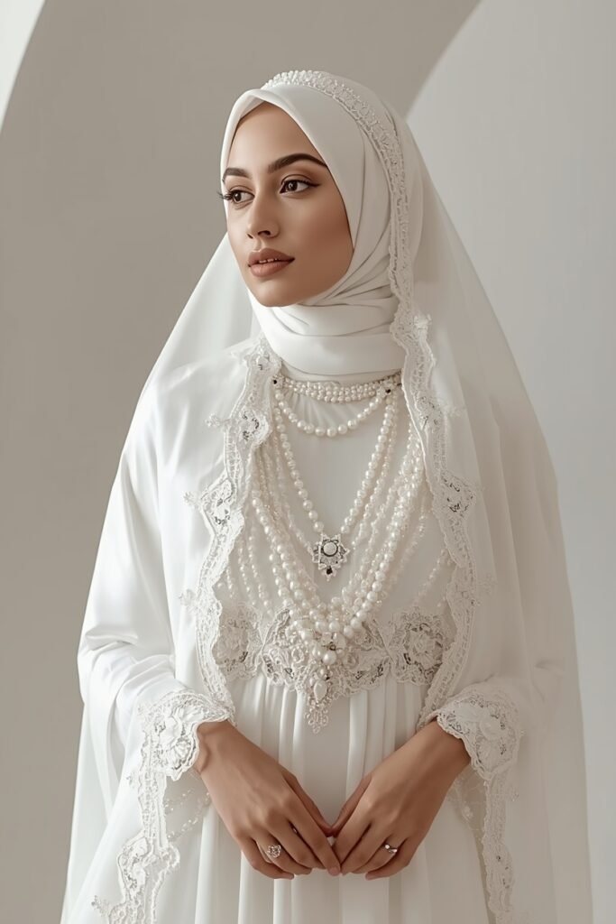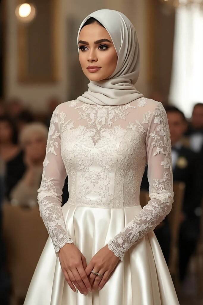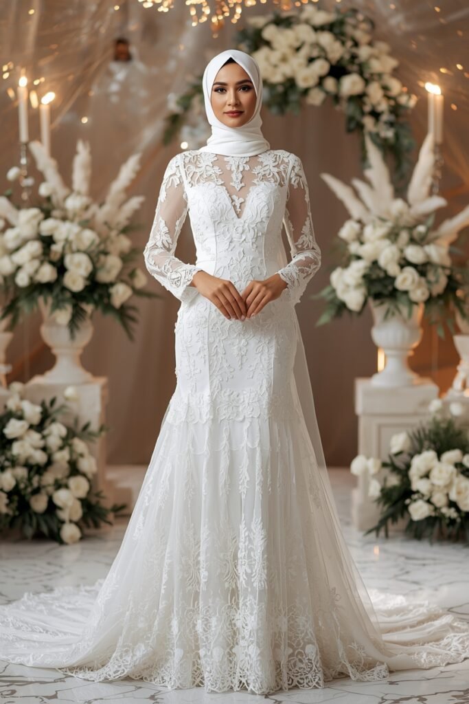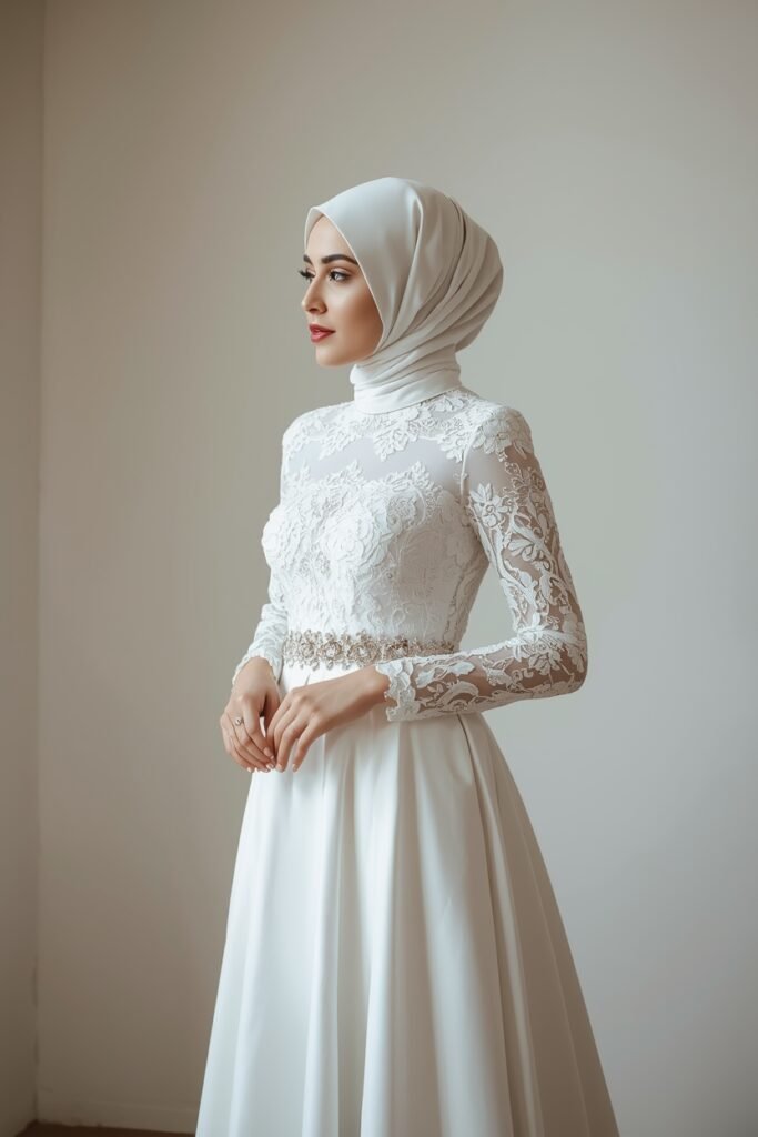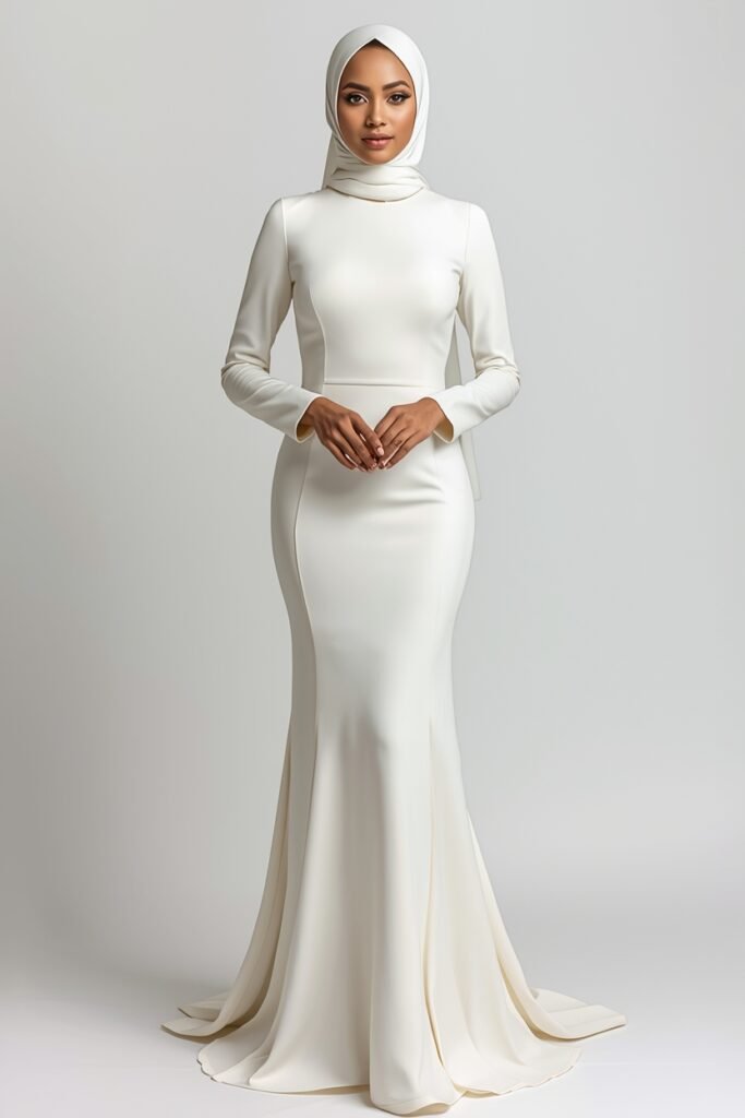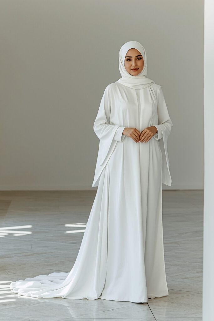 Why I Love This: It bridges the gap between traditional Western bridal fashion and Islamic modesty requirements. You get the white dress moment while staying covered.