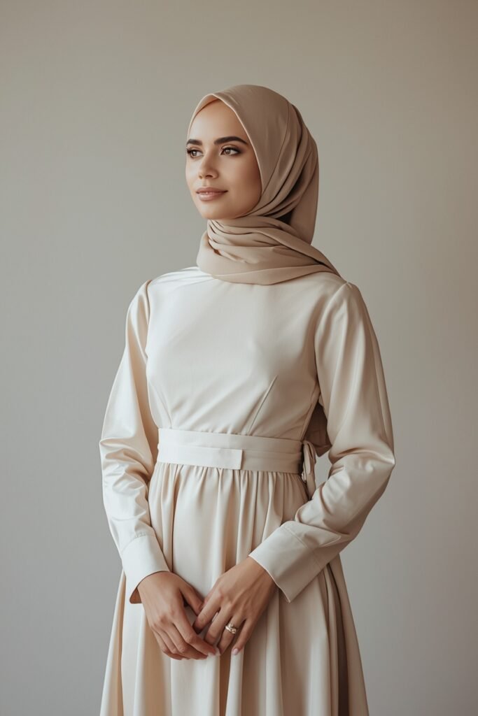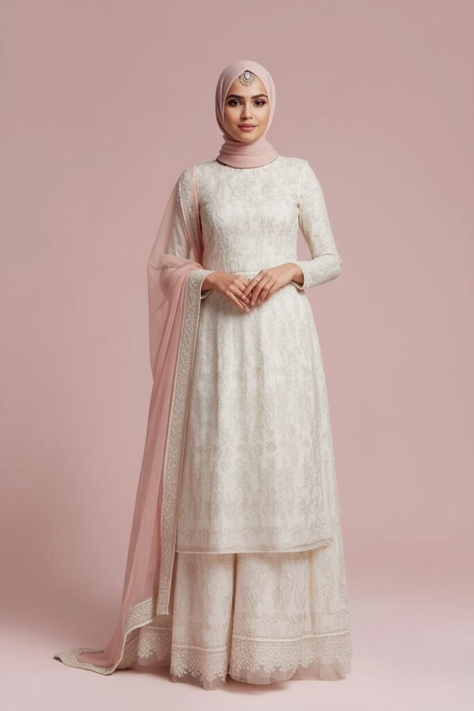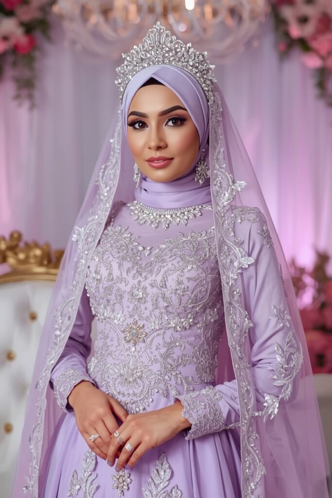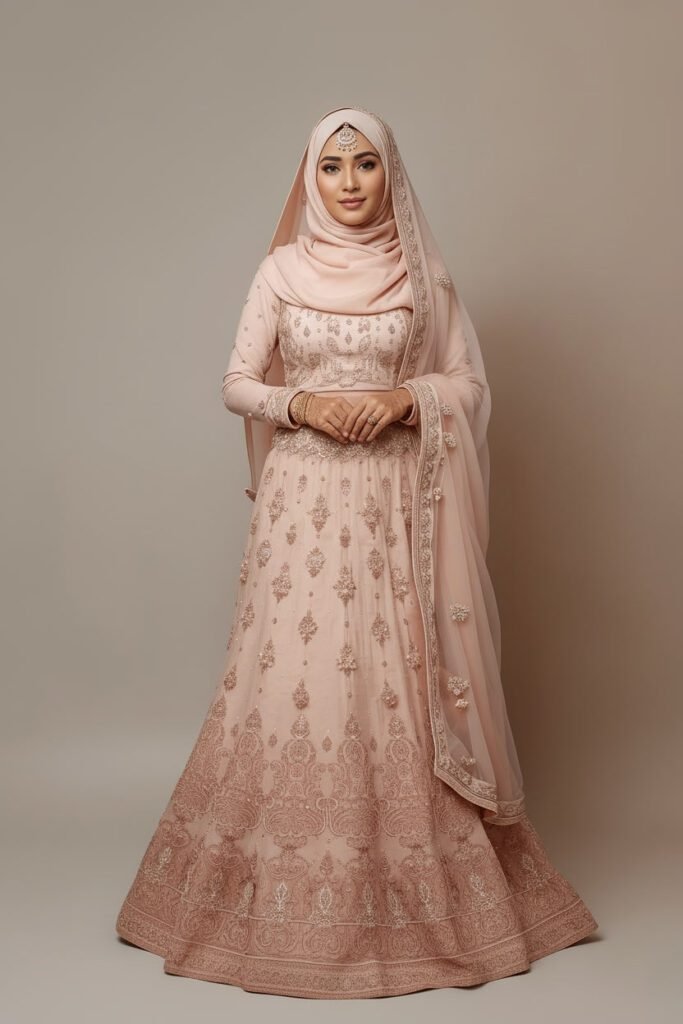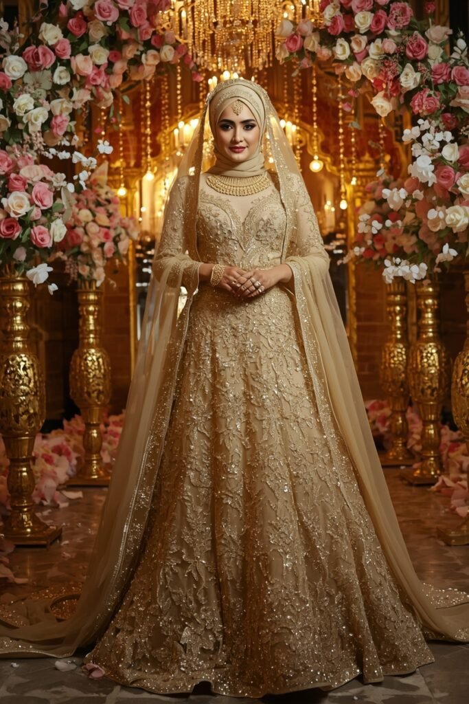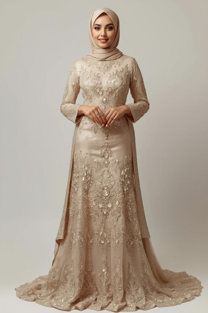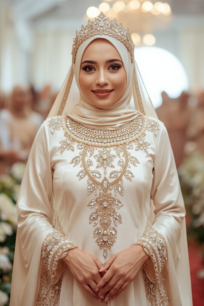 Why I Love This: It bridges the gap between traditional Western bridal fashion and Islamic modesty requirements. You get the white dress moment while staying covered.