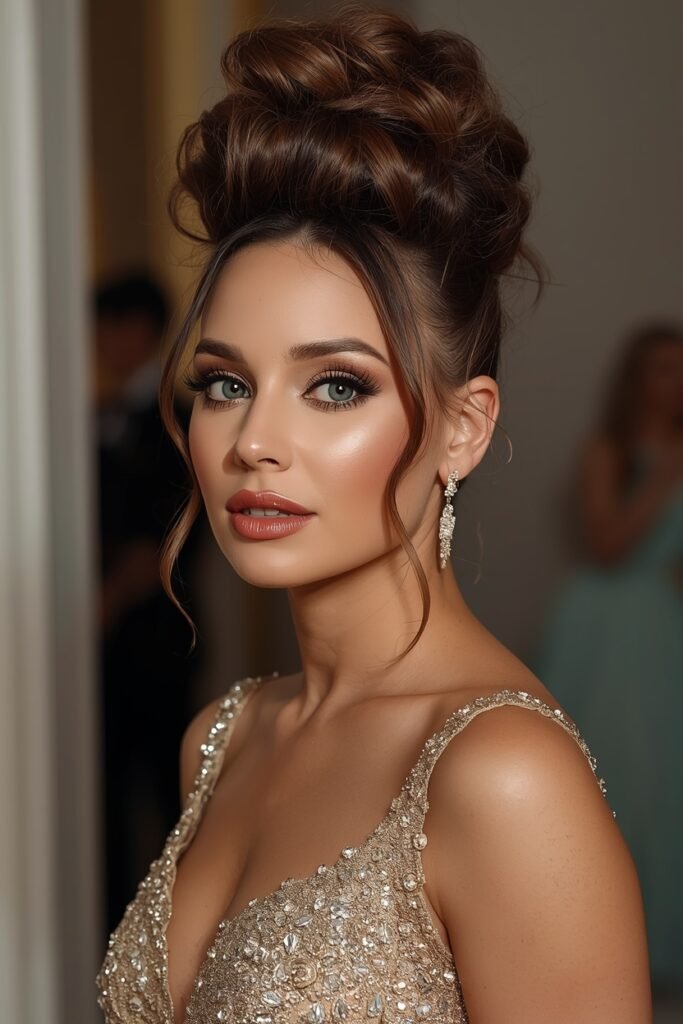 Structured updo. High sleek bun or sculpted waves pinned elegantly. Very polished very intentional. Use a strong hold gel or mousse to keep everything smooth and in place. No flyaways allowed.