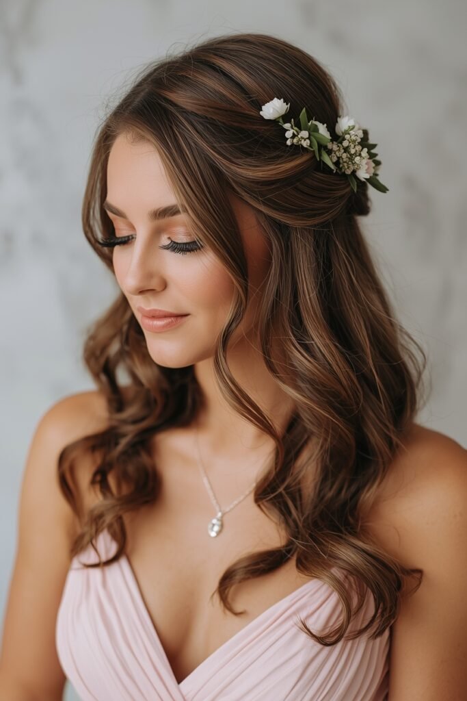Loose half up style with gentle twists or small plaits pulled back. Leave the rest of the hair in soft curls. Very romantic very bridal party appropriate.