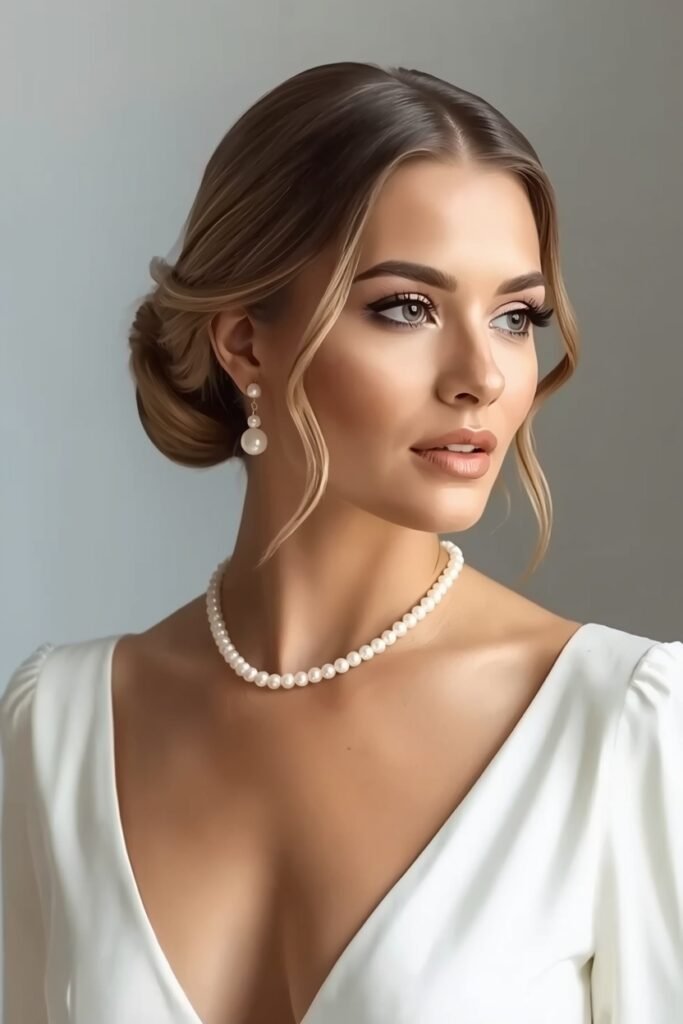 Low sleek bun at the nape of the neck with soft pieces framing the face. Very elegant very controlled. Smooth the hair back with a brush and some serum for shine. Leave a few wispy bits loose for a softer effect.