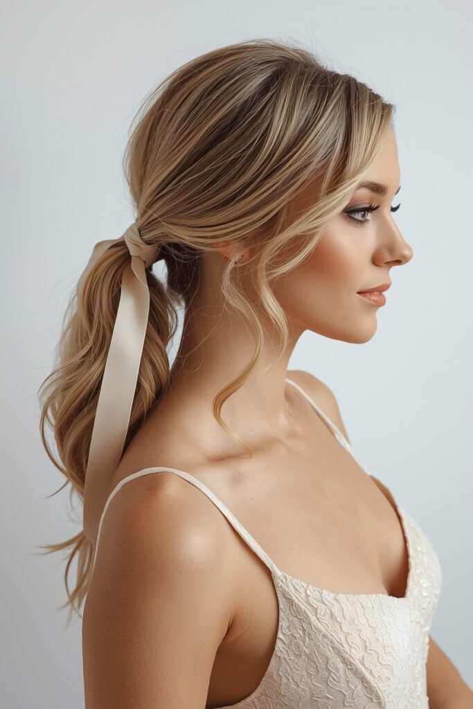 Simple low ponytail with curls or waves. Wrap a ribbon around the base for that regency touch. Keep it relaxed and easy.