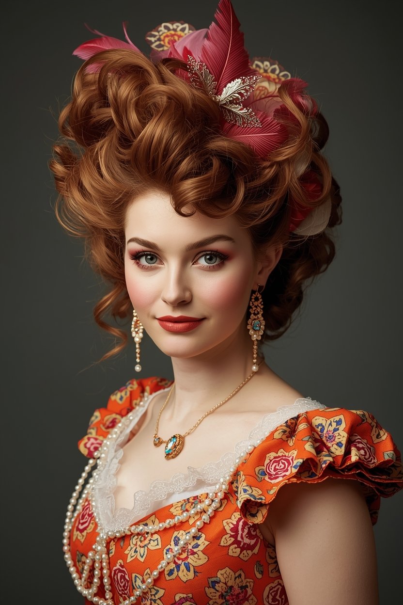 Voluminous elaborate updo. The bigger the better honestly. Think height curls twists braids all the drama. Tease the roots. Use a hair donut or padding for extra volume. Pin curls all around. This takes time but the impact is worth it.