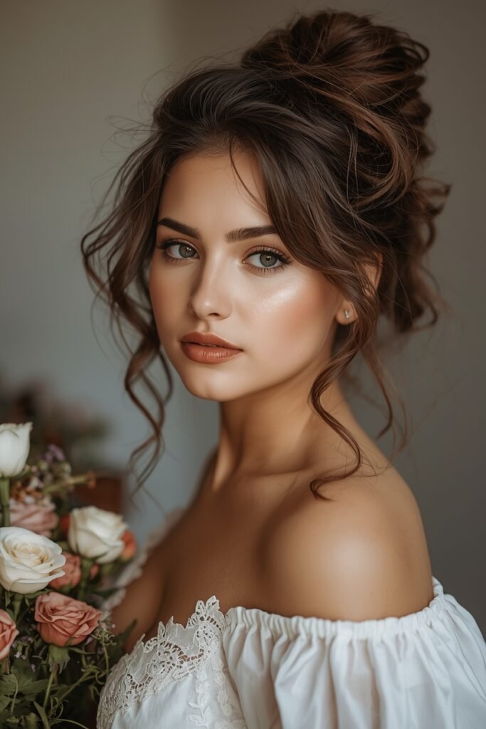 Loose romantic curls or a soft bun with fresh flowers tucked throughout. Very pretty very feminine. If doing curls keep them loose and bouncy. If doing a bun keep it soft and slightly messy not too structured.